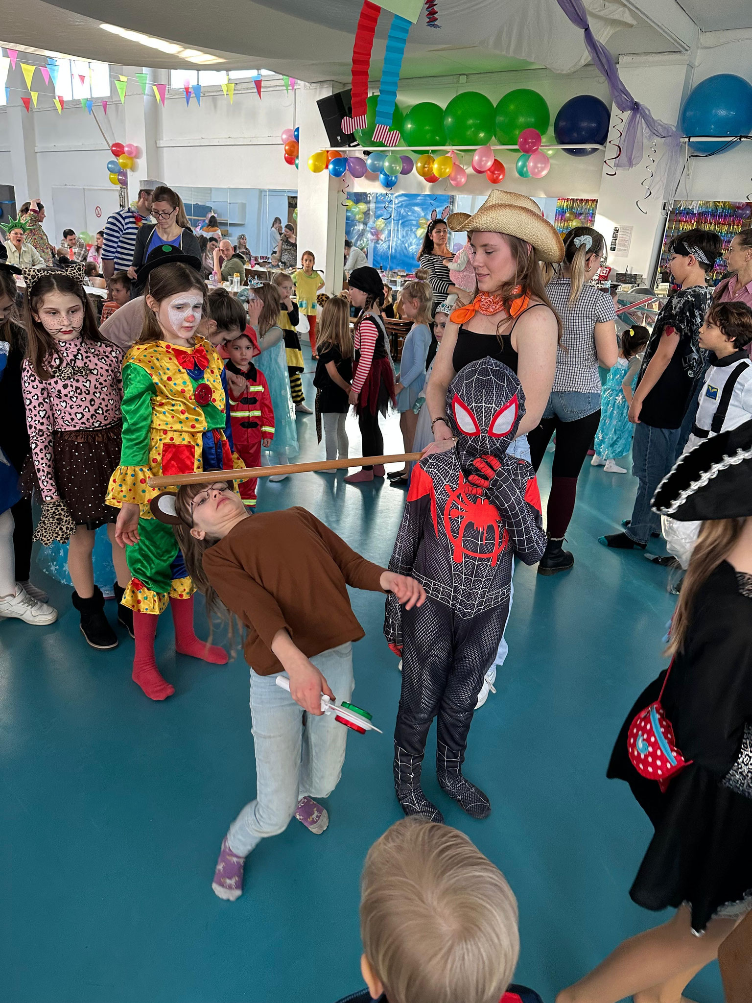 Am Freitag, den 21. 02. 2025 war es endlich wieder soweit. Nach einem Jahr Pause konnten wir wieder einen Kinderfasching veranstalten und zahlreiche Prinzessinnen, Elfen, Bienen, Superhelden, Feuerwehrleute und viele mehr in unserer bunt geschmückten Turnhalle begrüßen!