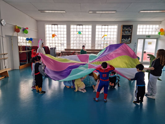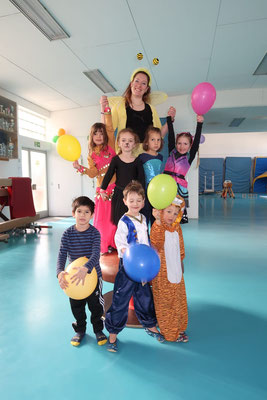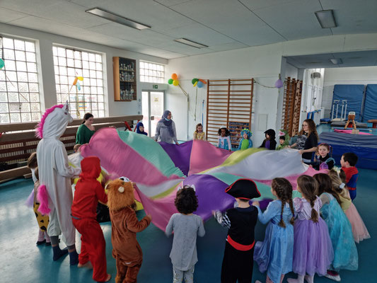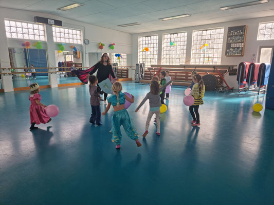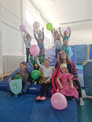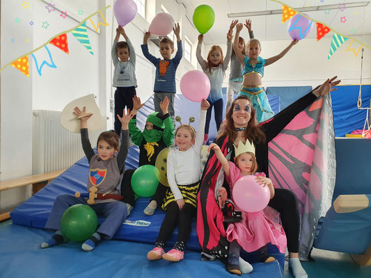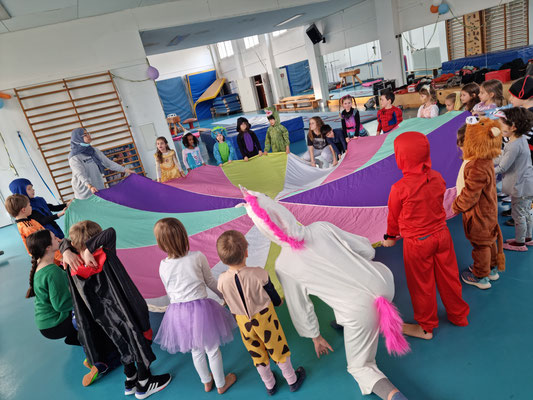 Jede Stunde war etwas anders. Es wurde getanzt zu „Cowboy und Indianer“, geturnt zu „Meine Oma fährt im Hühnerstall Motorrad“, Spiele gespielt wie „Die Reise nach Jerusalem“ oder auch tolle Dinge mit dem bunten Schwungtuch gemacht. In einer Turnstunde haben sich die Co-Trainerinnen etwas ganz Tolles einfallen lassen und haben die Kids nach Wunsch geschminkt. Die Halle war wieder toll mit bunten Luftballons geschmückt und jedes Kind hat nach der Turnstunde einen Ballon geschenkt bekommen.
